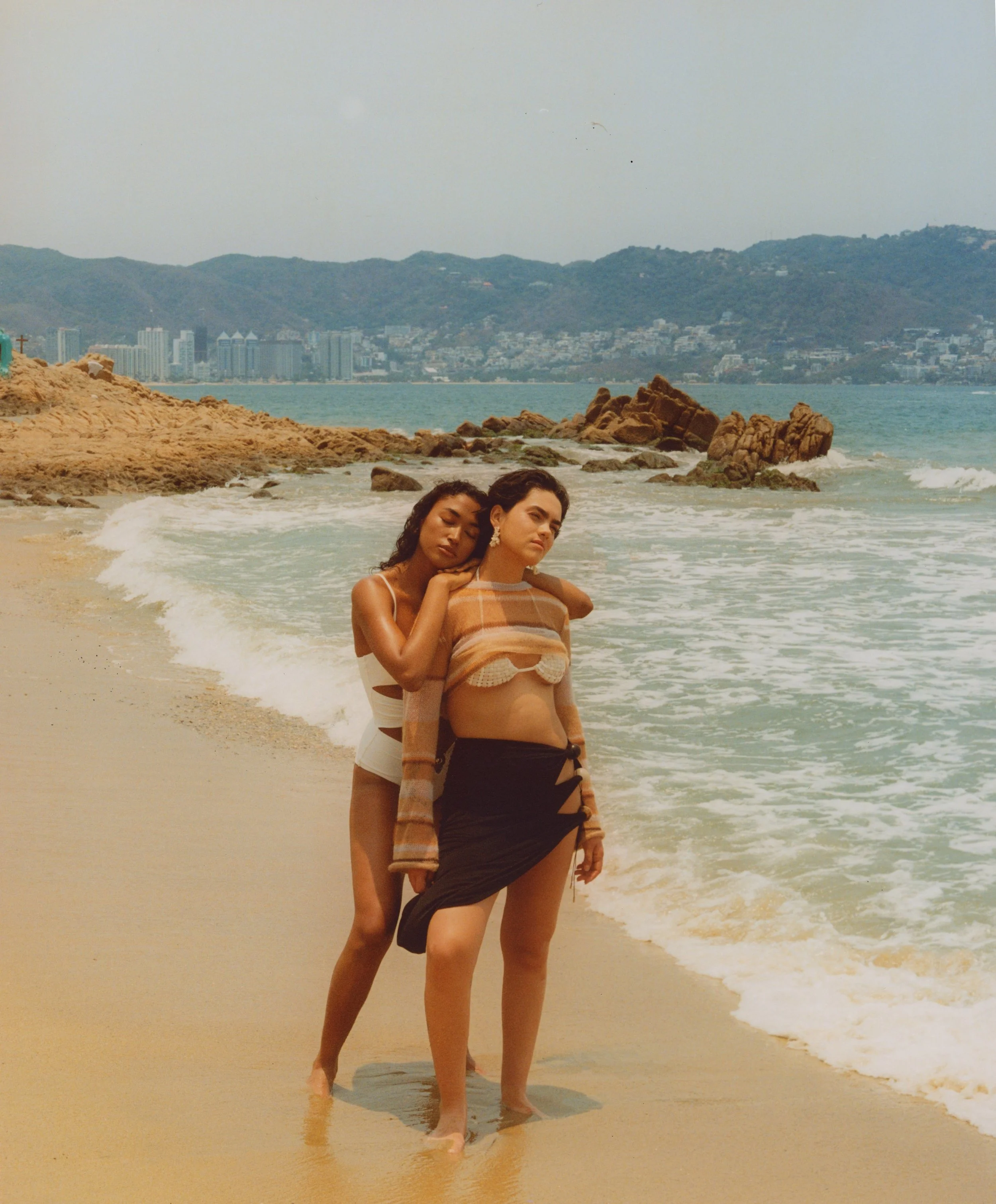 swimsuit Christopher Esber. on right – sweater Acne, bikini Isa Boulder, skirt Jacquemus, earrings Completedworks